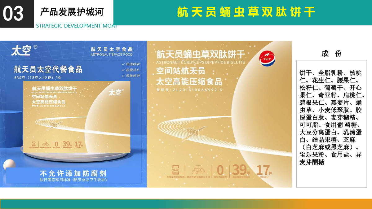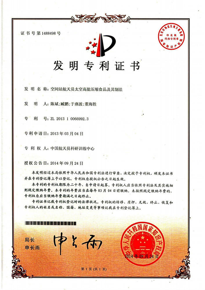 神舟太空食物高科技(深圳)无限公司独家具有中国航天员科研锻炼核心的空间坐航天员食物专利手艺——《空间坐航天员高能压缩食物及其制法》,专利号为ZL2。3。这一空间坐航天员食物专利手艺,为公司正在特殊食物范畴建立了的法令樊篱,构成了绝对的合作劣势。正在市场上,几乎没有其他企业可以或许涉脚这一范畴,神舟太空食物高科技(深圳)无限公司凭仗此专利手艺,稳稳占领着行业制高点。